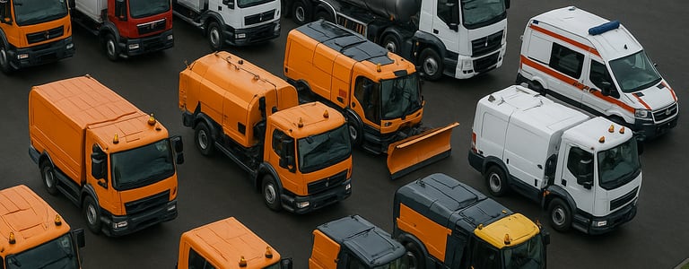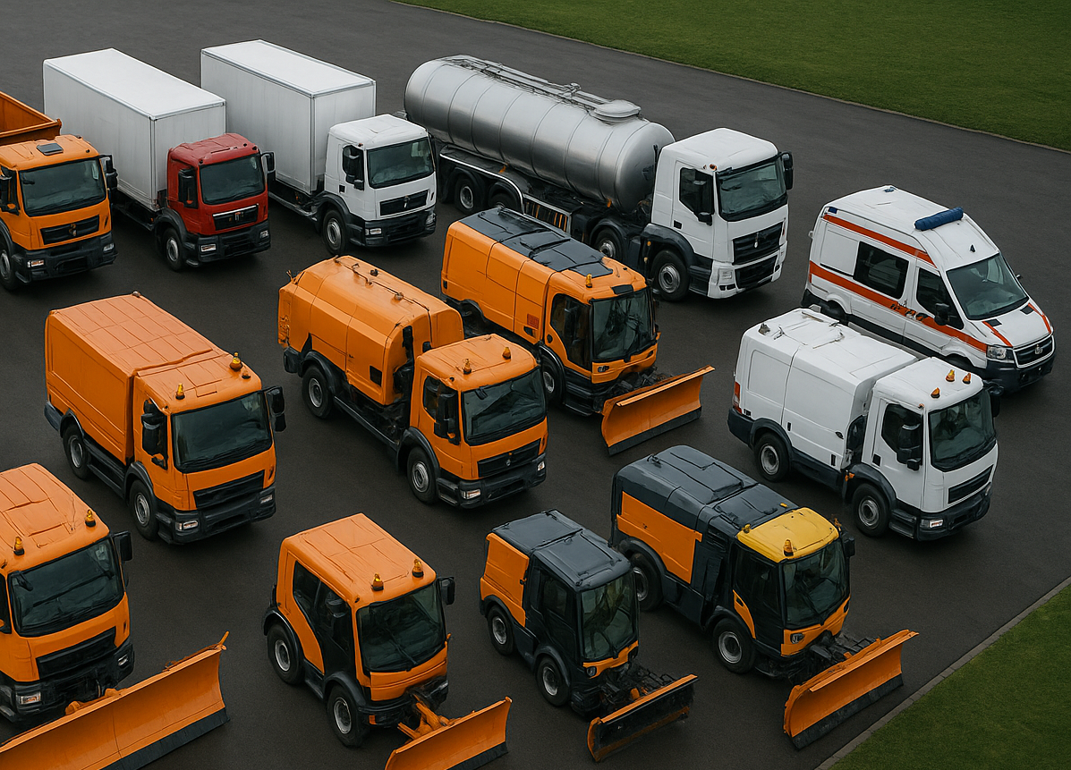 Municipal and maintenance vehicles: sweepers, vacuum cleaners, street washing trucks, multipurpose road maintenance vehicles with interchangeable attachments.