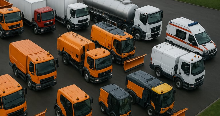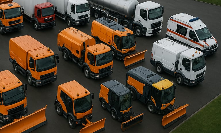 Veicoli comunali e per la manutenzione: spazzatrici, aspiratori stradali, autobotti per il lavaggio, veicoli multifunzionali con attrezzature intercambiabili.